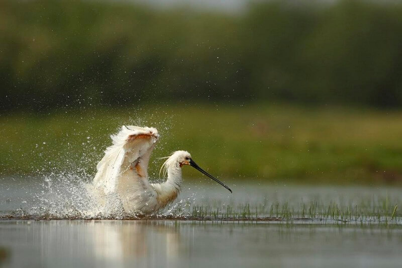 Par une des rares journées de chaleur (enfin !) Cigognes blanches et Spatules blanches nicheuses prennent l’habitude de se baigner, s’immergeant quasi complètement. Quelques battements d’ailes pour évacuer le plus gros des gouttes, un petit temps au soleil et le plumage tout détrempé va vite sécher au soleil. Cela ne fait pas oublier les préoccupations de construction, même quand les jeunes sont nés, notamment après les pluies, les adultes ramènent toujours des matériaux secs ou verts au nid.