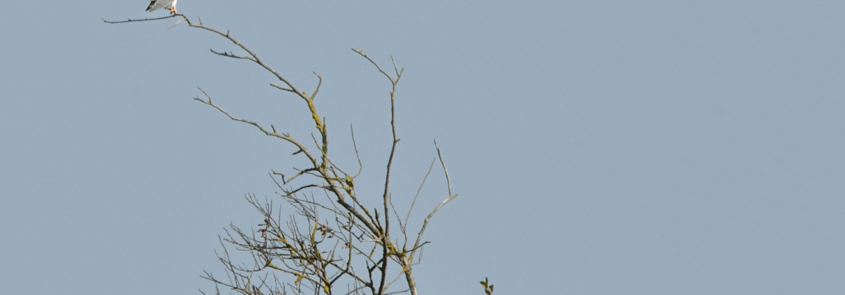 Lors des récentes surprises en matière d’espèces rares au Parc du Marquenterre, l’Élanion blanc (Elanus caeruleus), au grand bonheur des observateurs, a fait son apparition. Cet élégant rapace, blanc et gris comme une mouette, avec le dessous des rémiges (plumes de vol) noir, se distingue par son œil rouge vif et ses pattes jaunes à orangées. Par la taille, il est un peu plus grand qu’un Faucon crécerelle, celui que l’on observe couramment au bord des routes.