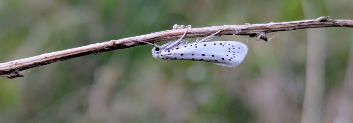 C’est dans cette explosion de couleurs qu’elle est apparue, si élégante dans son manteau d’hermine : une femelle de Grand Yponomeute du Fusain (Yponomeuta cagnagella). J’ai d’abord cru que ce minuscule papillon de nuit venait en esthète au vernissage de ma fructification. Elle parcourait mes branches de son corps fluet, mesurant à peine un centimètre, pour une envergure de 25 millimètres. Ses ailes antérieures, d’un blanc soyeux, étaient mouchetées de trois rangées longitudinales de points noirs ; elles cachaient des ailes postérieures plutôt grisâtres, nettement frangées.