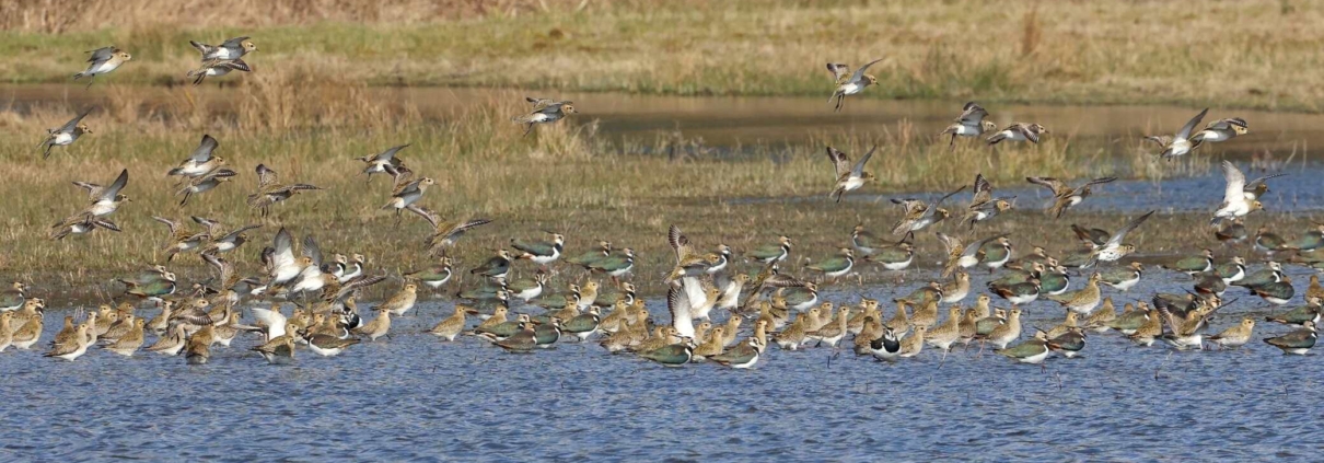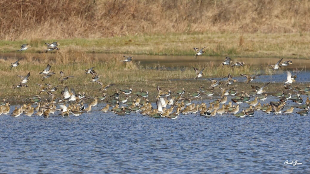 Ces petits limicoles rondouillards au magnifique dos mordoré (surtout quand il y a un rayon de soleil !) nous viennent aussi bien de Scandinavie que du nord- ouest de la Russie pour hiverner chez nous. Ils sont souvent en compagnie des Vanneaux huppés en stationnement au sol, même si en vol ils restent généralement entre eux. Il faut dire que leurs ailes longues et étroites leur donnent un vol bien plus direct et rapide que celui de leur cousin huppé. Au loin, ils font alors penser à des déplacements aériens d’Etourneaux sansonnets. Lors des attaques du Faucon pèlerin, ils augmentent les arabesques et resserrent les rangs pour désorienter le prédateur dans sa capacité de déceler visuellement la proie idéale. On retrouve ce phénomène chez les petits poissons avec la tactique du banc face à la prédation du thon, dauphin ou requin…