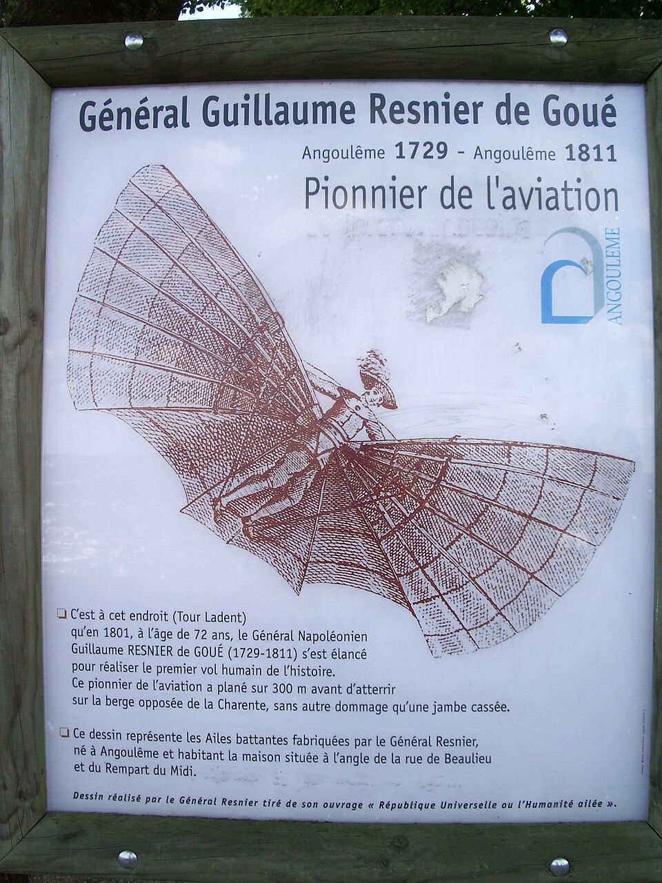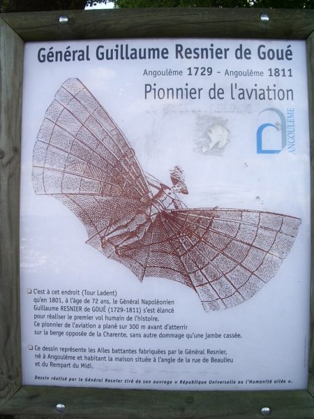 Histoire : Certains ont tenté de voler comme des oiseaux… avec des résultats désastreux mais on retiendra ce premier vol mythique du Général Guillaume Resnier de Goué. Il réussira à parcourir 300 mètres de vol plané, en ne se cassant qu’une jambe !! 😆