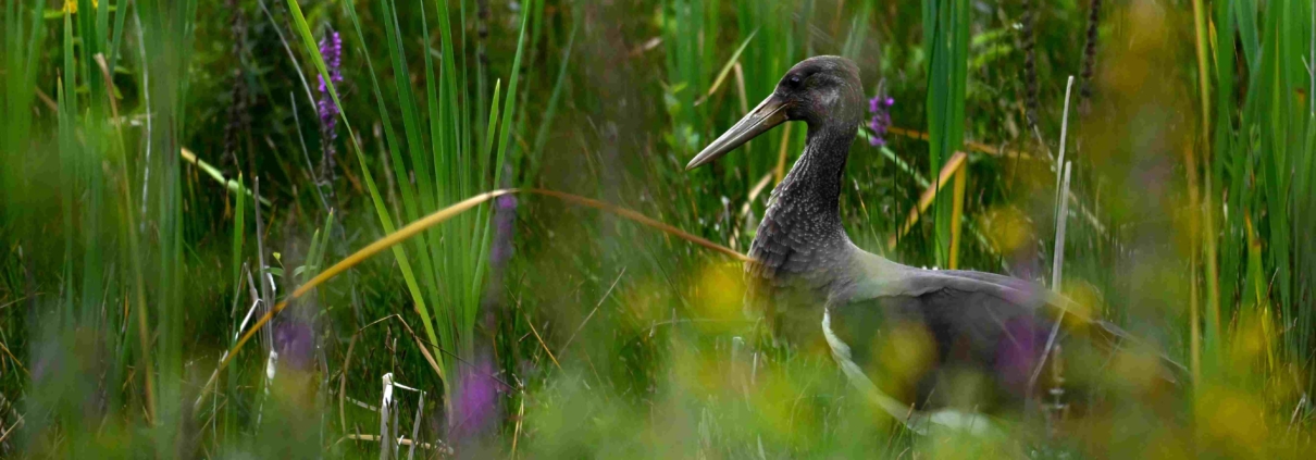 Cette Cigogne noire (Ciconia nigra), baguée Y2214, s’est laissé guider par les courants. Elle passe ses journées à se nourrir des amphibiens et divers autres insectes pendant sa halte migratoire. Il s’agit de sa première migration : son bec est jaune à la base et tire vers le noir, tout comme ses pattes, et nous indique qu’elle est née ce printemps 2025. Celui-ci deviendra complètement rouge, comme celui de sa cousine la Cigogne blanche, d’ici une année.