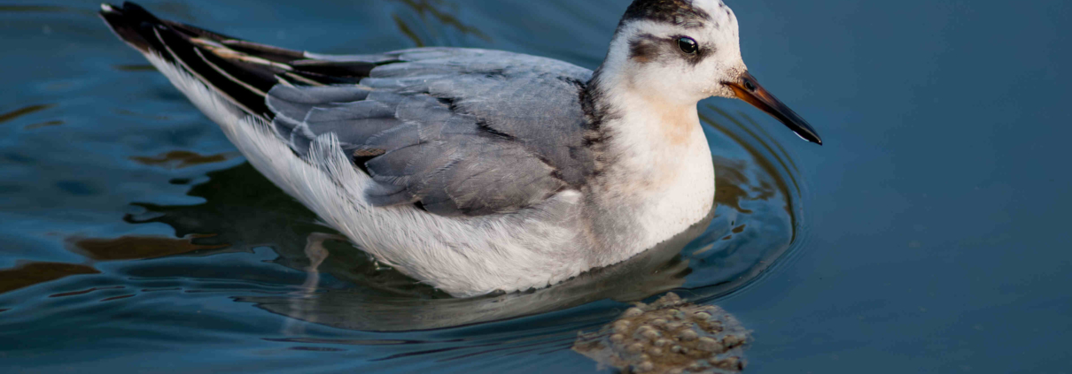 Pas manqué, c’est un adulte en mue de Phalarope à bec large qui navigue sur nos eaux saumâtres, se nourrissant de zooplancton à la surface de l’eau ! Cette espèce nous vient des côtes de l’Arctique, allant de l’Alaska à la Sibérie ; les populations européennes sont localisées en Islande, au Spitzberg et au Groenland, où il niche dans les tourbières et la toundra humide.